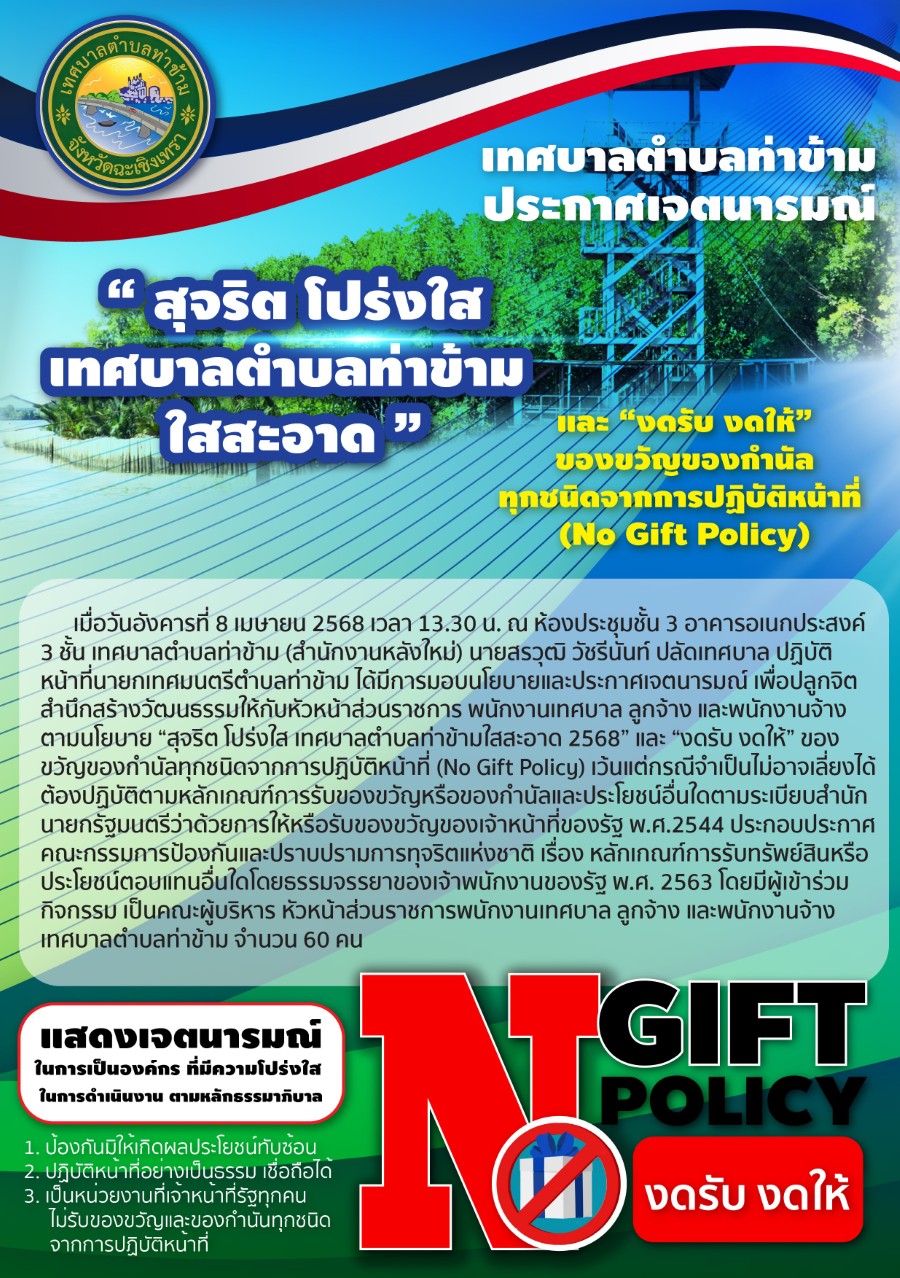 นโยบายการไม่รับของขวัญและของกำนัลทุกชนิดจากการปฎิบัติหน้าที่ (No Gift Policy) ประจำปีงบประมาณ พ.ศ.2568