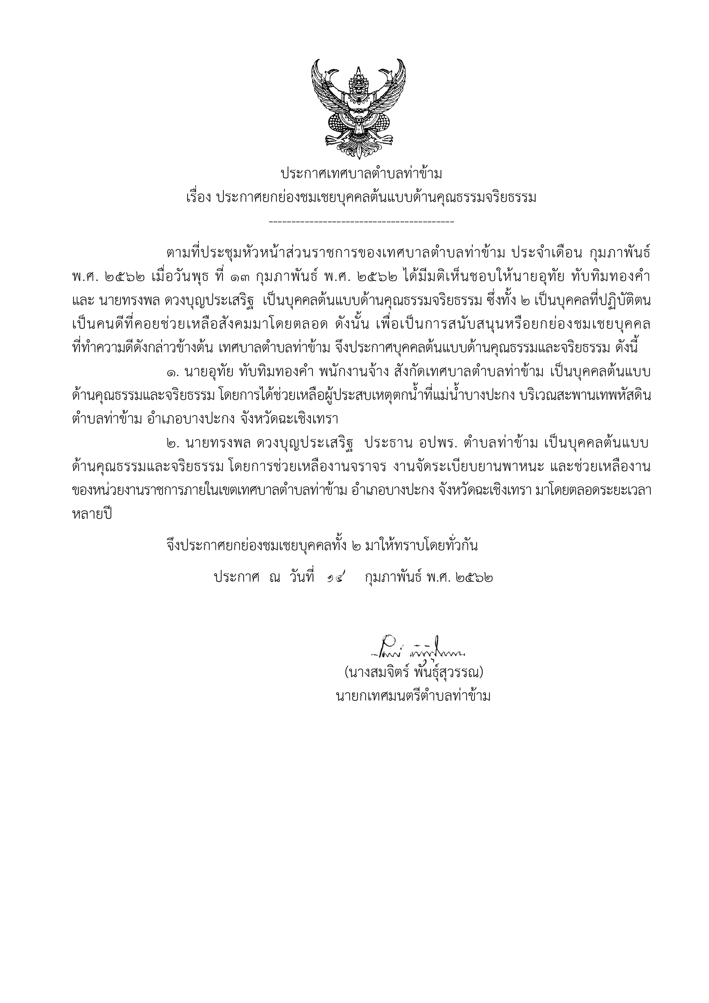 ยกย่องชมเชยบุคคลต้นแบบด้านคุณธรรมจริยธรรม ประจำปีงบประมาณ พ.ศ.2562